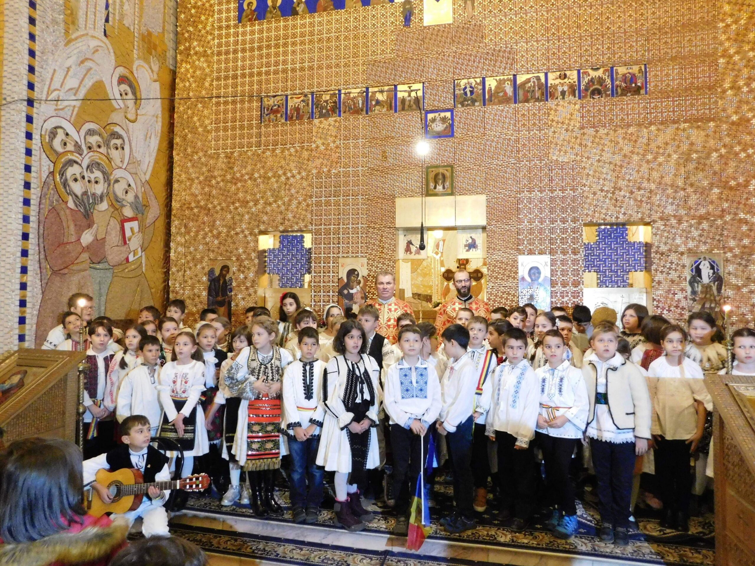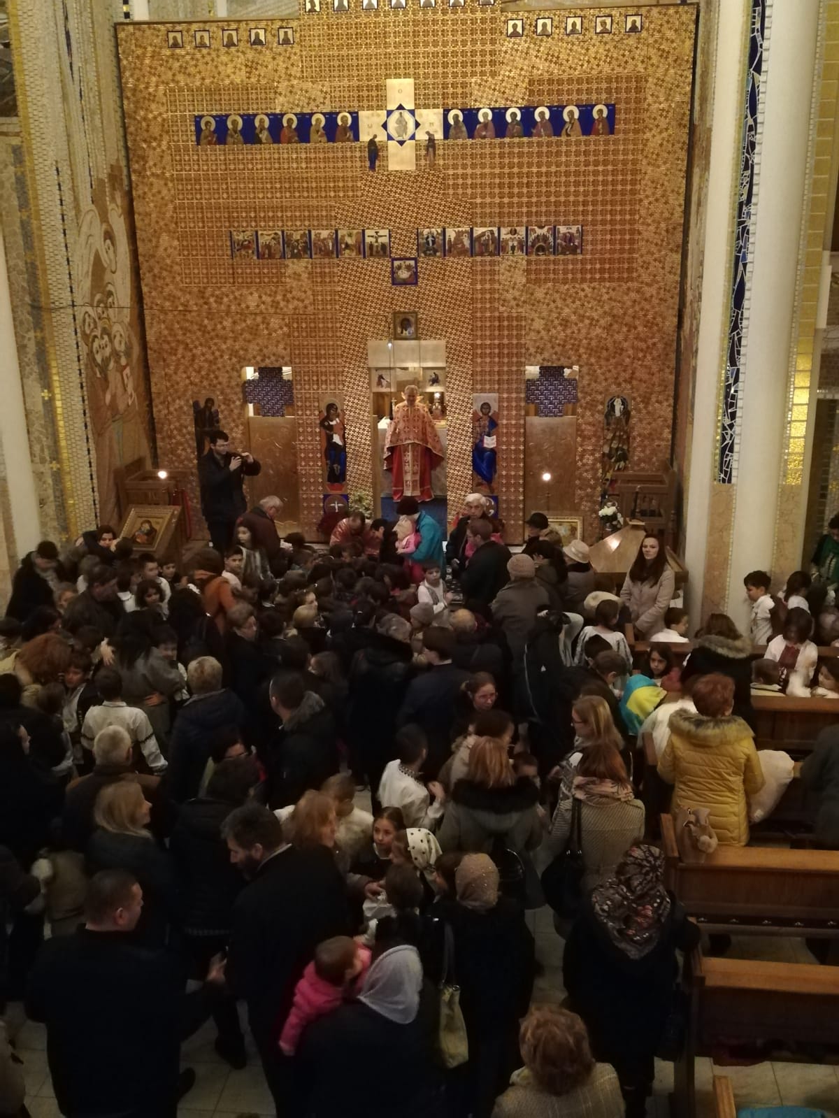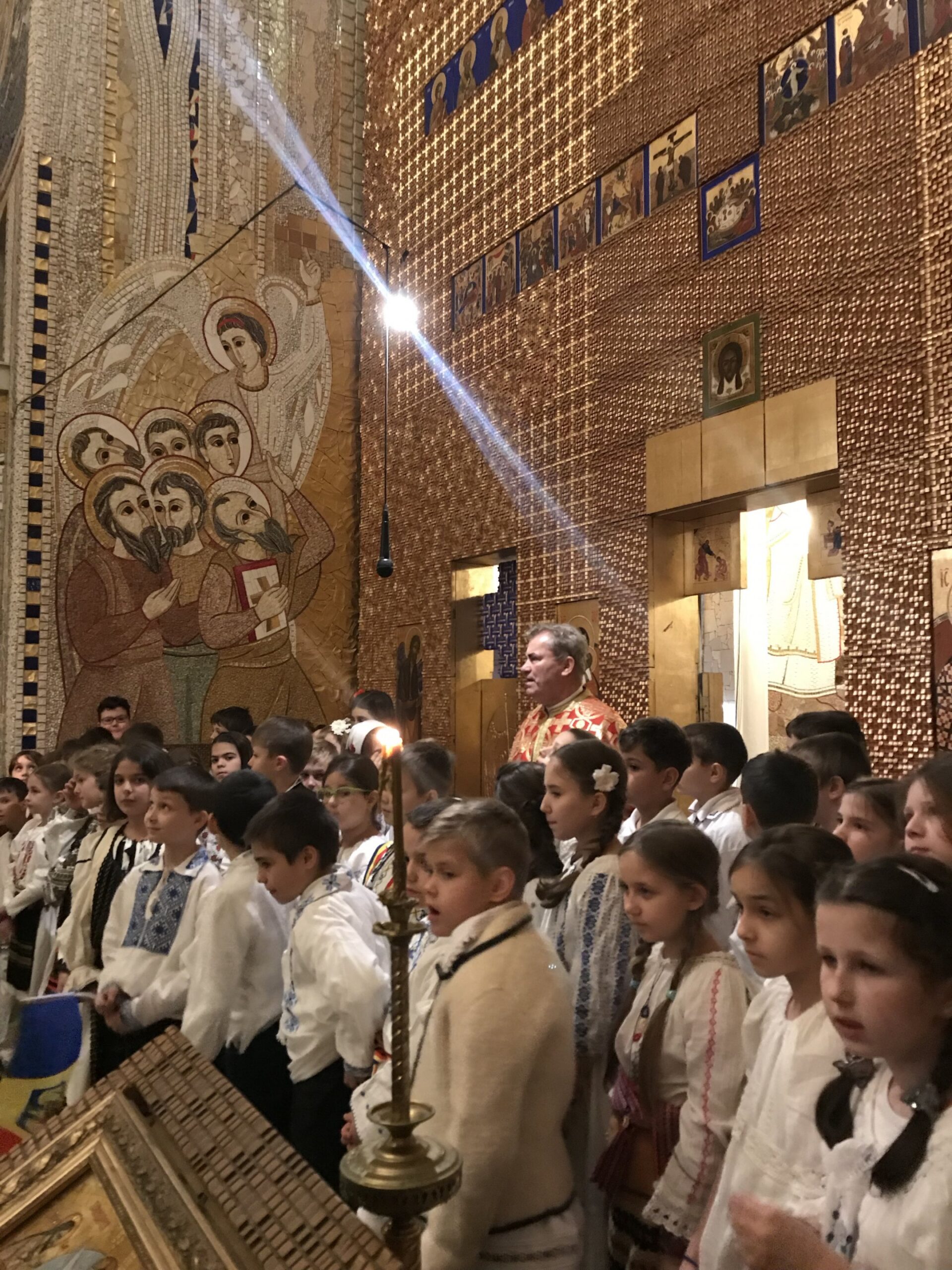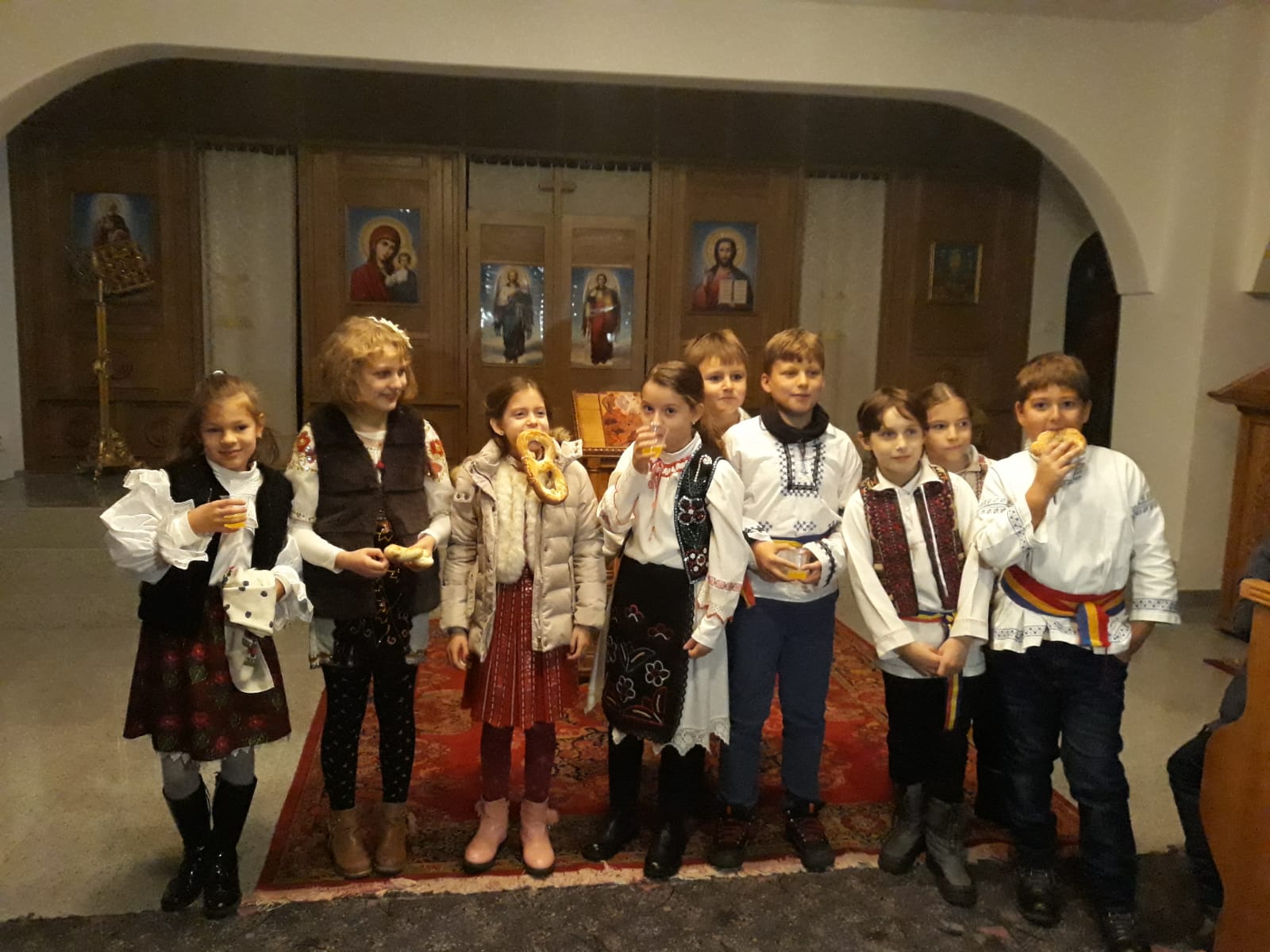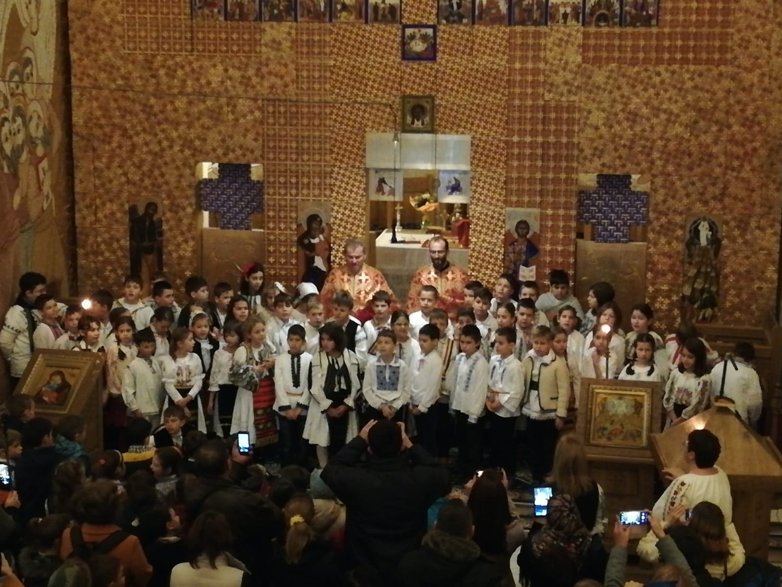Copiii clasei a I-a B, coordonați de d-na înv. Cosmina Tămaș, s-au împărtășit, după ce au participat și ei la Sfânta Liturghie, și s-au bucurat de momentul artistic al colegilor mai mari.